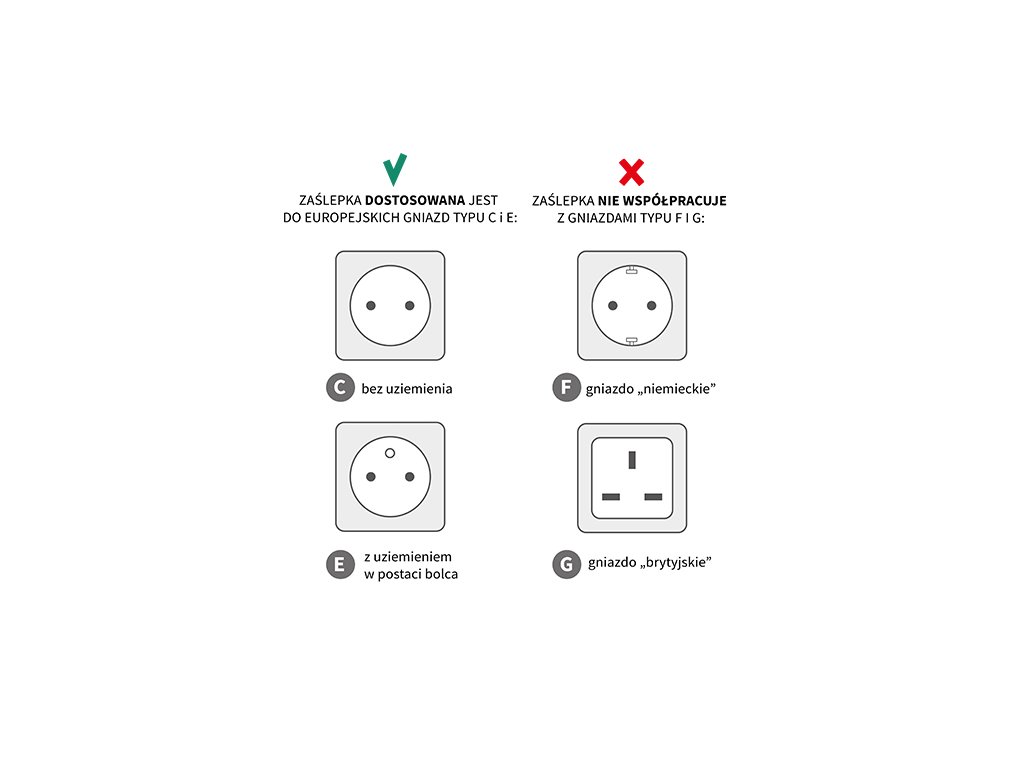 - Ochrana je vhodná pro zásuvky typu E (s uzemněním) a typu C (bez uzemnění).