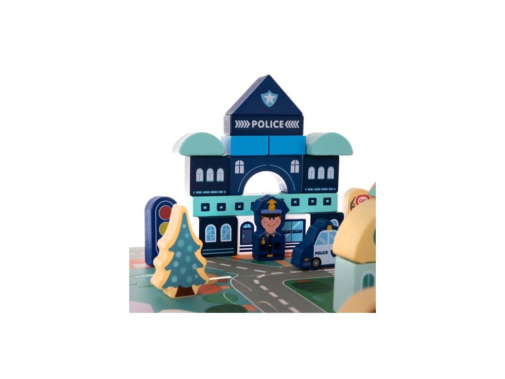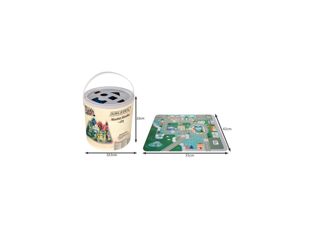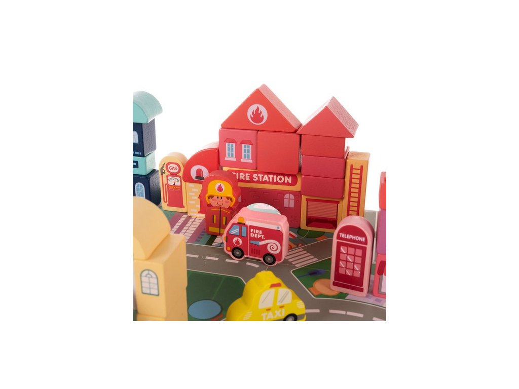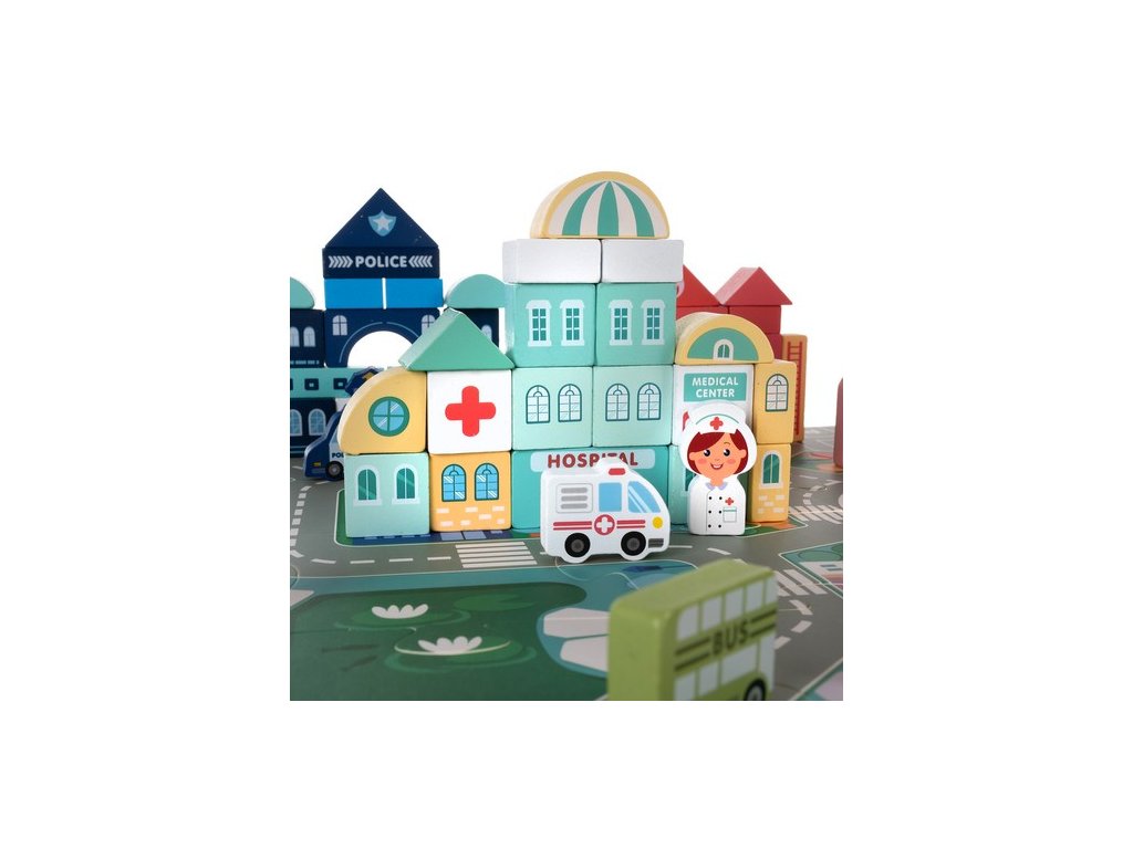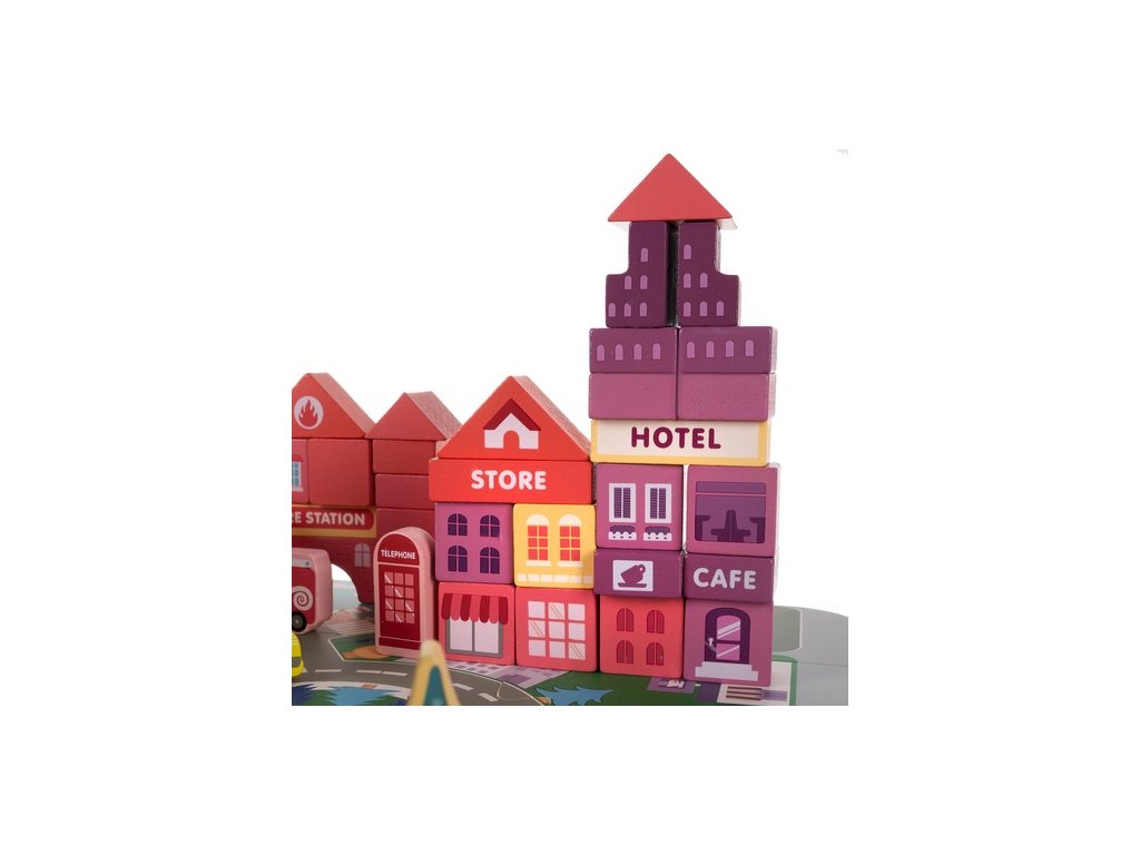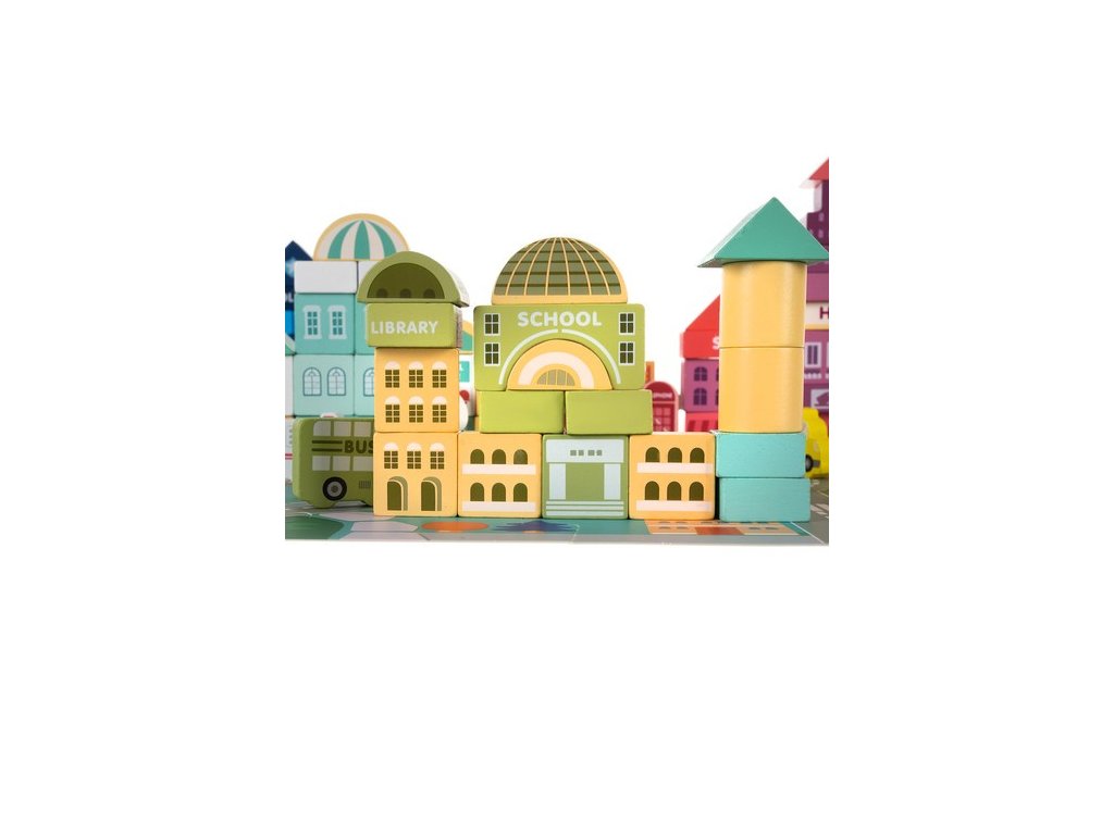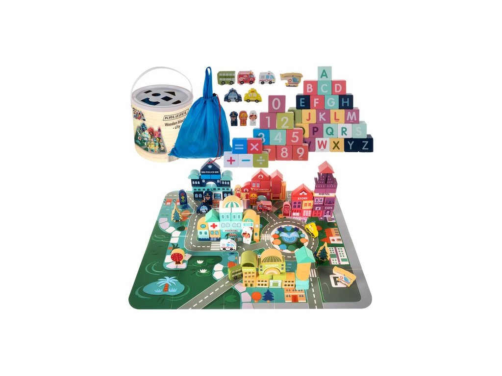 Dřevěné kostky ve tvaru města jsou splněným snem pro každého malého stavitele. Tato obrovská sada obsahuje 100 dřevěných kostek a 20 dílků puzzle, ze kterých děti mohou postavit celé město. Najdete zde vše, co ke skutečnému městu patří: budovy (škola, banka, nemocnice), dopravní prostředky (hasiči, policie, autobus) i figurky lidí. Hračka rozvíjí kreativitu, učí trpělivosti a efektivně bojuje s nudou.