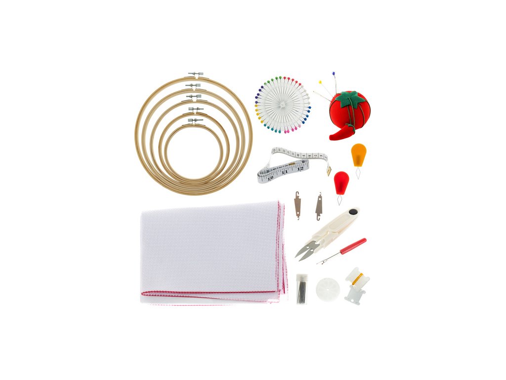 - Kompletní sada obsahuje veškeré potřebné nástroje (nůžky, náprstek, jehly, obruče, atd.) pro okamžité zahájení práce.