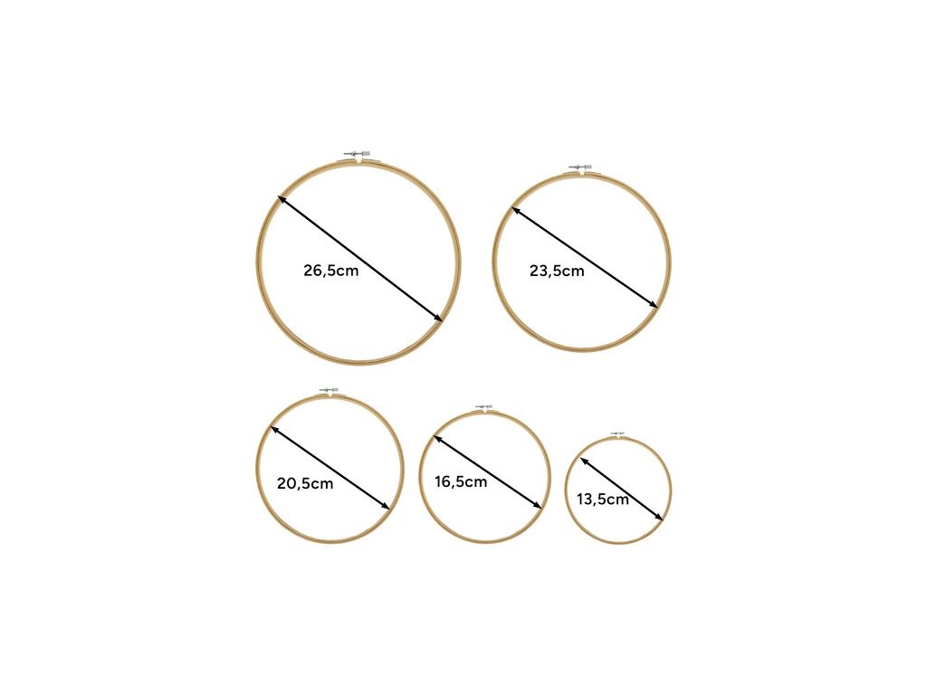 - Průměr obručí: 11,3 cm, 14,5 cm, 18,5 cm, 22,5 cm, 25,6 cm (5 ks)