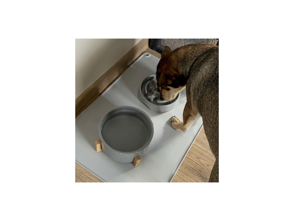 - Zajišťuje, že misky zůstanou na svém místě během krmení, čímž snižuje nepořádek.