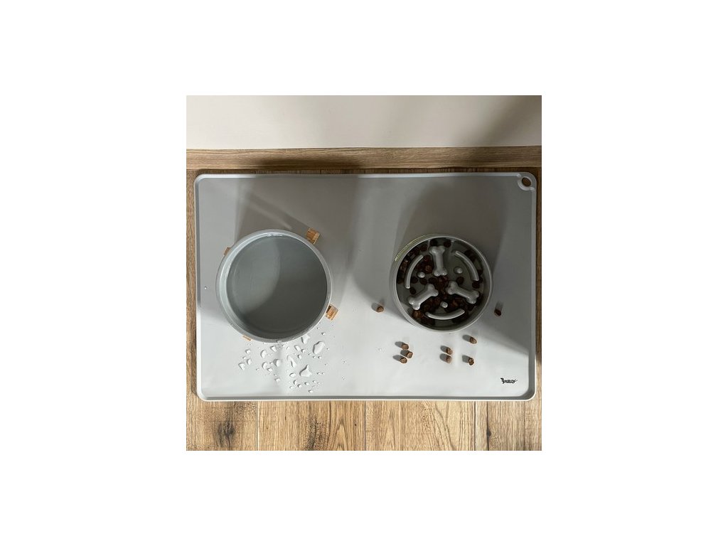 Silikonová podložka představuje ideální řešení, jak ochránit vaši podlahu před rozlitou vodou, zbytky jídla a nečistotami. Díky svým rozměrům se do ní snadno vejdou dvě misky různých velikostí pro psy i kočky. Je vyrobena z odolného a kvalitního silikonu, který je trvanlivý, snadno se čistí a nevydává žádné pachy, což zvíře neodradí od krmení. Praktické zvýšené okraje účinně zadržují tekutiny a usnadňují úklid.